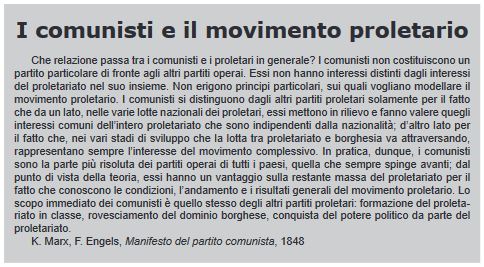 Che relazione passa tra i comunisti e i proletari in generale? I comunisti non costituiscono un partito particolare di fronte agli altri partiti operai. Essi non hanno interessi distinti dagli interessi del proletariato nel suo insieme. Non erigono principi particolari, sui quali vogliano modellare il movimento proletario. I comunisti si distinguono dagli altri partiti proletari solamente per il fatto che da un lato, nelle varie lotte nazionali dei proletari, essi mettono in rilievo e fanno valere quegli interessi comuni dell’intero proletariato che sono indipendenti dalla nazionalità; d’altro lato per il fatto che, nei vari stadi di sviluppo che la lotta tra proletariato e borghesia va attraversando, rappresentano sempre l’interesse del movimento complessivo. In pratica, dunque, i comunisti sono la parte più risoluta dei partiti operai di tutti i paesi, quella che sempre spinge avanti; dal punto di vista della teoria, essi hanno un vantaggio sulla restante massa del proletariato per il fatto che conoscono le condizioni, l’andamento e i risultati generali del movimento proletario. Lo scopo immediato dei comunisti è quello stesso degli altri partiti proletari: formazione del proletariato in classe, rovesciamento del dominio borghese, conquista del potere politico da parte del proletariato.