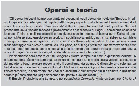 Tutte le deviazioni ideologiche manifestatesi nella storia del movimento comunista internazionale e che, sia esplicitamente che sottotraccia, sono presenti tutt’ora nelle determinazioni della classe in conseguenza dell’influenza ideologica esercitata della borghesia, siano esse caratterizzate dall’idealismo o dal materialismo meccanicista, dall’opportunismo o dall’avventurismo, provengono dal distacco della conoscenza teorica dalla pratica rivoluzionaria.