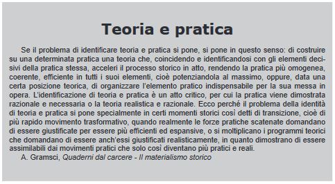 Se il problema di identificare teoria e pratica si pone, si pone in questo senso: di costruire su una determinata pratica una teoria che, coincidendo e identificandosi con gli elementi decisivi della pratica stessa, acceleri il processo storico in atto, rendendo la pratica più omogenea, coerente, efficiente in tutti i suoi elementi, cioè potenziandola al massimo, oppure, data una certa posizione teorica, di organizzare l’elemento pratico indispensabile per la sua messa in opera. L’identificazione di teoria e pratica è un atto critico, per cui la pratica viene dimostrata razionale e necessaria o la teoria realistica e razionale. Ecco perché il problema della identità di teoria e pratica si pone specialmente in certi momenti storici così detti di transizione, cioè di più rapido movimento trasformativo, quando realmente le forze pratiche scatenate domandano di essere giustificate per essere più efficienti ed espansive, o si moltiplicano i programmi teorici che domandano di essere anch’essi giustificati realisticamente, in quanto dimostrano di essere assimilabili dai movimenti pratici che solo così diventano più pratici e reali.