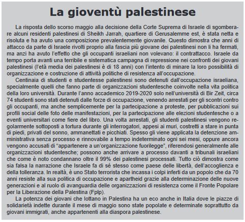 Da settanta anni Israele e i suoi alleati occidentali, in prima fila Usa e i paesi dell’Unione Europea, provano a imporre il loro controllo sul territorio palestinese ma la Resistenza del popolo palestinese riesce a tener testa agli occupanti, come è accaduto anche questo maggio. La decisione del governo israeliano, il 6 maggio scorso, di sfrattare 7 famiglie palestinesi dal quartiere di Sheirkh Jarrah a Gerusalemme est e il giorno successivo gli abusi della polizia israeliana durante il primo giorno di Ramadan alla moschea di al-Aqsā, sono stati i detonatori di una serie di scontri nei territori occupati e dei bombardamenti a Gaza, ma anche della risposta palestinese, con incessanti lanci di missili sulla colonia israeliana, terminati con il cessate il fuoco accordato tra Hamas e Israele il 21 giugno. Durante questo mese l’appoggio alla lotta per la liberazione della Palestina ha avuto il sostengo di settori di massa in tanti paesi mentre, come era prevedibile, mentre le classi dominanti reazionarie si sono schierate dalla parte di Israele.