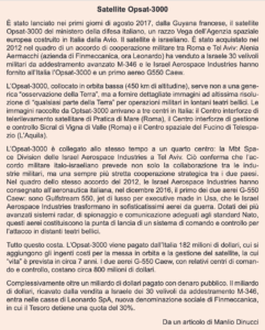 È stato lanciato nei primi giorni di agosto 2017, dalla Guyana francese, il satellite Opsat-3000 del ministero della difesa italiano, un razzo Vega dell’Agenzia spaziale europea costruito in Italia dalla Avio. Il satellite è israeliano. È stato acquistato nel 2012 nel quadro di un accordo di cooperazione militare tra Roma e Tel Aviv: Alenia Aermacchi (azienda di Finmeccanica, ora Leonardo) ha venduto a Israele 30 velivoli militari da addestramento avanzato M-346 e le Israel Aerospace Industries hanno fornito all’Italia l’Opsat-3000 e un primo aereo G550 Caew.