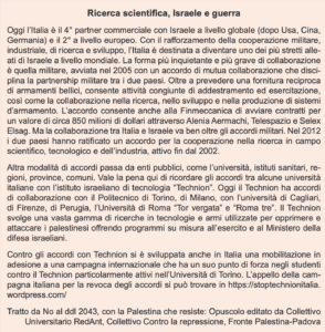 Contro gli accordi con Technion si è sviluppata anche in Italia una mobilitazione in adesione a una campagna internazionale che ha un suo punto di forza negli studenti contro il Technion particolarmente attivi nell’Università di Torino. L’appello della campagna italiana per la revoca degli accordi si può trovare in https://stoptechnionitalia.wordpress.com/