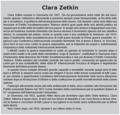 Clara Zetkin nacque in Germania nel 1857. Sin da giovanissima entrò nelle fila del movimento operaio, militandovi attivamente e ponendo sempre come fondamentale, ai fini della lotta per il socialismo, il problema dell’emancipazione della donna. Già durante i primi anni della sua iscrizione al Partito Socialdemocratico Tedesco dedicò gran parte della sua attività politica ad organizzare le lotte delle lavoratrici del suo paese. In quegli anni andava sviluppandosi una massiccia ed insidiosa corrente riformista che faceva deviare il movimento operaio dal suo obiettivo storico, la conquista del potere. Anche in questo caso il suo contributo fu immenso: nel 1915, dopo il tradimento della socialdemocrazia di molti paesi durante la Prima guerra mondiale, organizzò una Conferenza internazionale socialista femminile che si tenne a Berna, in Svizzera, dove levò la sua voce contro la guerra imperialista, per la fraternità dei popoli e sottolineando l’importanza della solidarietà internazionale femminile.