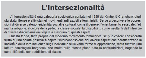 L’intersezionalità è una categoria sociologica coniata nel 1989 da Kimberlè Crenshaw, giurista statunitense e attivista nei movimenti antirazzisti e femministi. Serve a descrivere le oppressioni di diverse categorie/identità sociali e culturali come il genere, l’orientamento sessuale, l’etnia, la religione, il colore della pelle, la classe sociale, la disabilità… come risultanti dall’intreccio di diverse discriminazioni legate a ciascuno di questi aspetti.