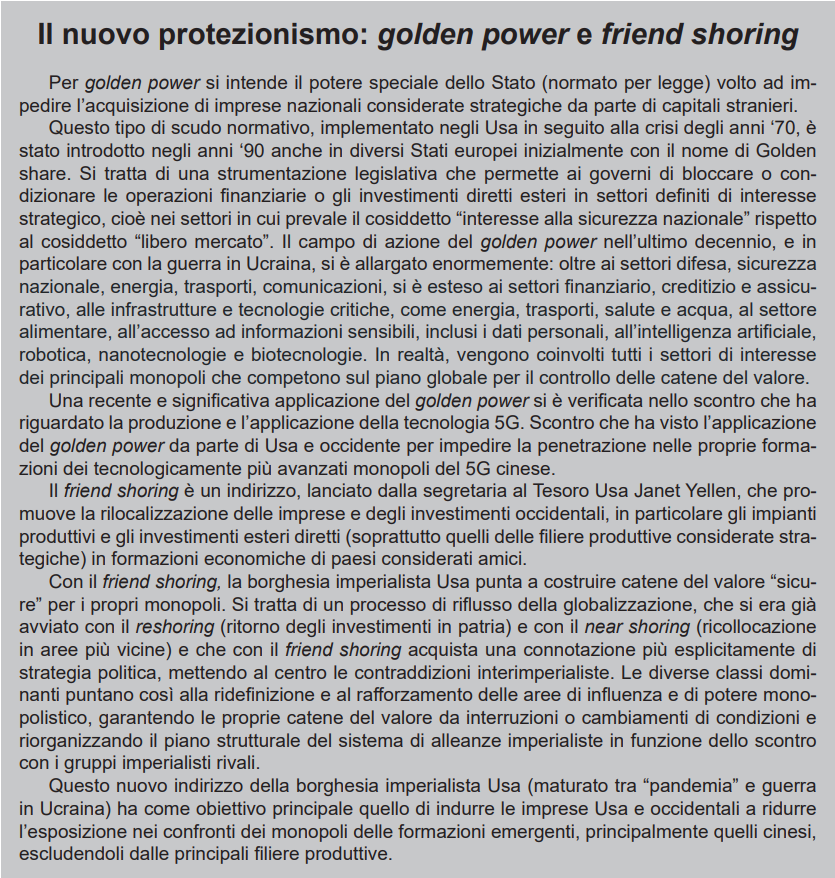 in aree più vicine) e che con il friend shoring acquista una connotazione più esplicitamente di strategia politica, mettendo al centro le contraddizioni interimperialiste. Le diverse classi dominanti puntano così alla ridefinizione e al rafforzamento delle aree di influenza e di potere monopolistico, garantendo le proprie catene del valore da interruzioni o cambiamenti di condizioni e riorganizzando il piano strutturale del sistema di alleanze imperialiste in funzione dello scontro con i gruppi imperialisti rivali.