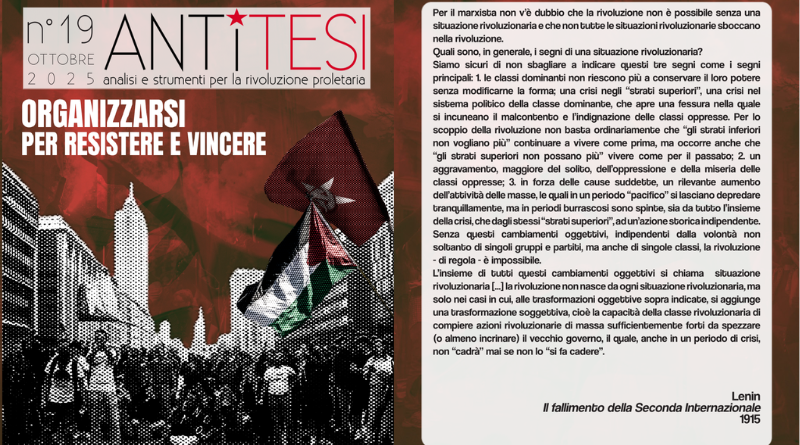 - In terza sezione, Imperialismo e guerra, con il primo articolo, L’Europa in guerra, trattiamo gli aspetti di divisione tra governo Usa e Ue sul piano politico, con la compagine europea che prova a darsi autonomia strategica rispetto al conflitto con la Russia, ma accetta i diktat di Trump sul riarmo perché funzionali in tal senso. Anche la Nato risulta depotenziata, divisa dalle contraddizioni interimperialiste che l’attraversano. Nel secondo articolo, 7 ottobre, due anni dopo, esaminiamo come la lotta del popolo palestinese, a due anni dall’operazione Diluvio di Al Aqsa lanciata dalla Resistenza Palestinese, incarni il fattore rivoluzionario più forte sullo scenario mondiale, rappresentando un’avanguardia politica internazionale per tutte le classi oppresse, e come, d’altro canto, il regime sionista rappresenti una delle forze trainanti della tendenza alla terza guerra mondiale ed alla reazione.