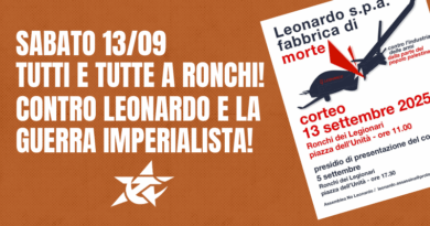 – 05/09 dalle 17.30 – Piazza dell’Unità, a Ronchi dei Legionari: per la presentazione del corteo del 13 settembre contro la multinazionale della guerra Leonardo;